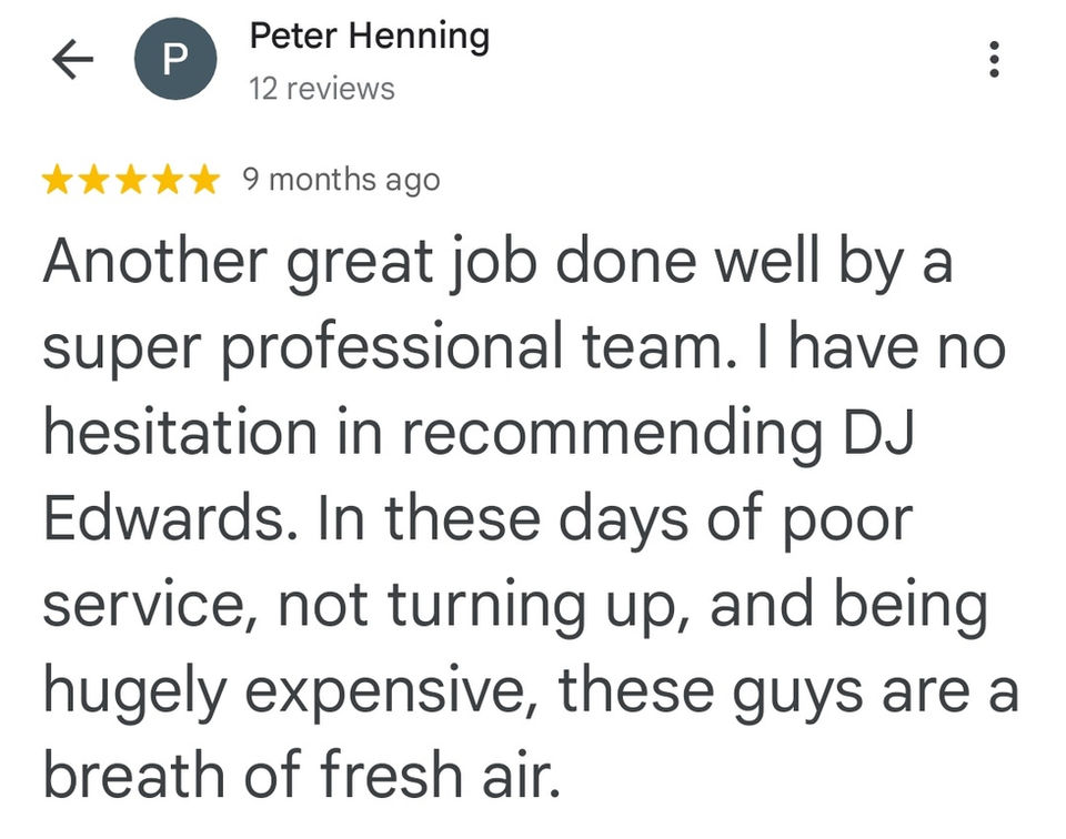 ⭐⭐⭐⭐⭐ "In these days of poor service, not turning up, and being hugely expensive, these guys are a breath of fresh air." - Peter Henning
